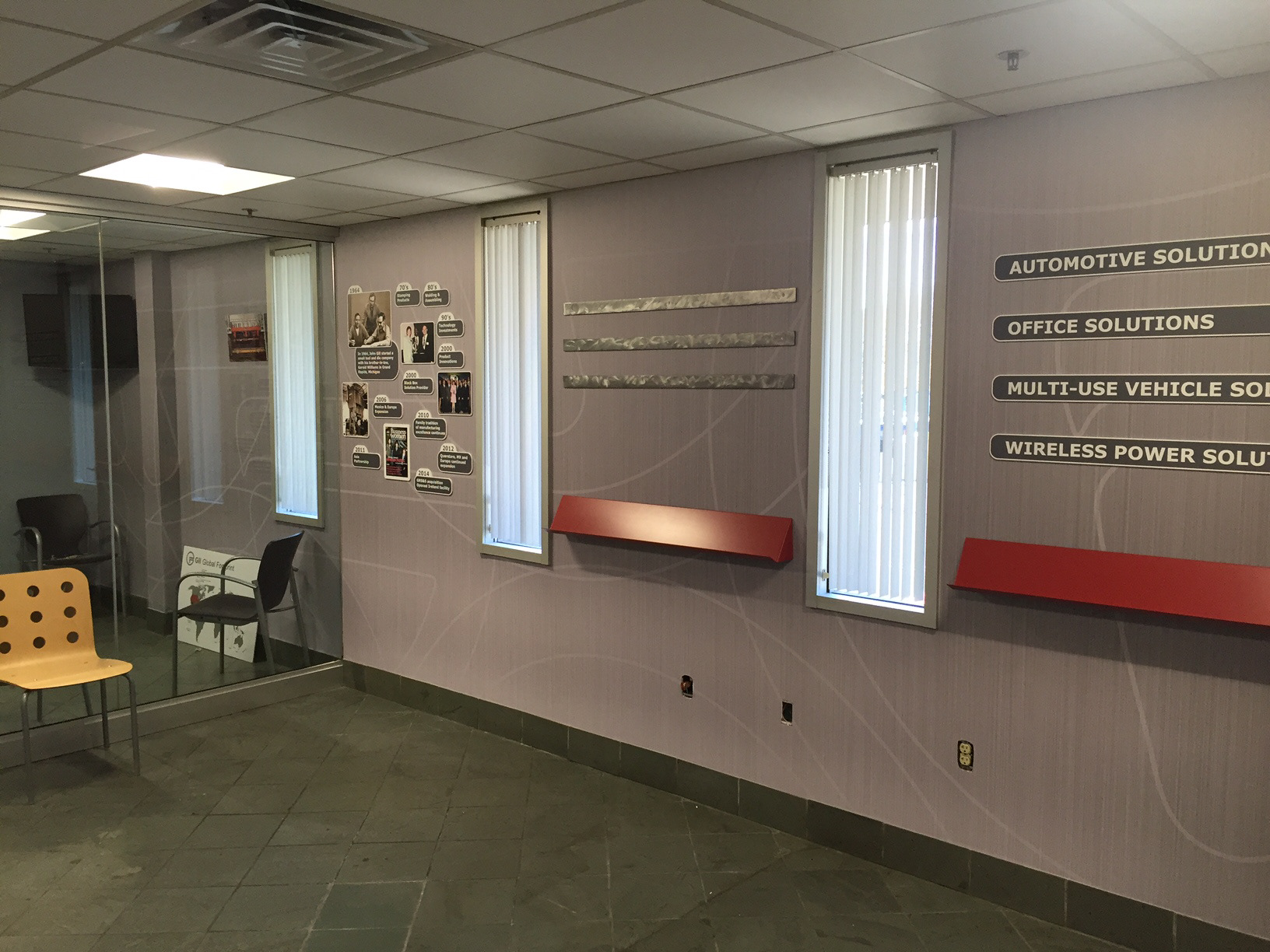 Partnering with Nimlok Michigan, Fab Creative designed an updated lobby space for Gill Industries. Project consists of custom designed and printed wallpaper, dimensional logo and photo panels, magnetic receptive display panels and shelves to display client's metal stamping products.
